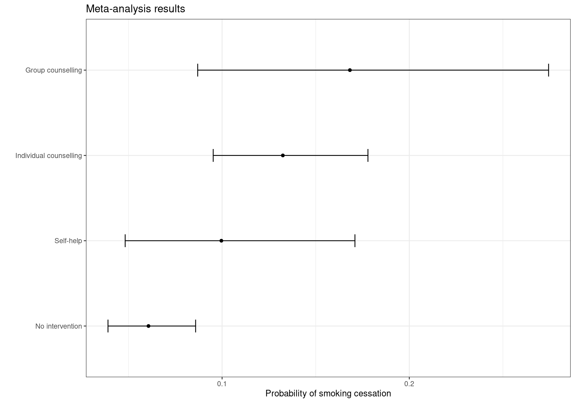 x="", y="Probability of smoking cessation", title="Meta-analysis results") +