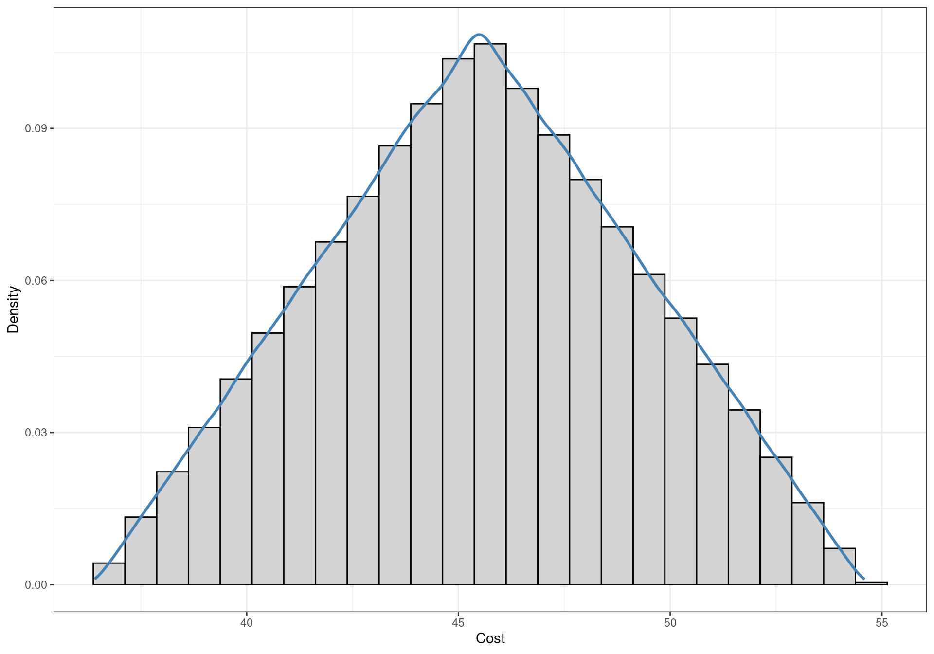install.packages("triangle")The code to obtain the simulated values from the probability distributions of the costs, stored in the cost matrix, is presented below. Since we populated the matrix with zeroes when creating the object, the costs for \(t=1\) are automatically assigned. The function rtriangle accepts as arguments the number of simulations needed, the lower bound of the distribution a and the upper bound b. If not specified, the mode of the distribution c is calculated by default as the average of the two extremes; since we are using symmetric distributions and thus the mode corresponds to the mean, there is no need to specify this parameter.