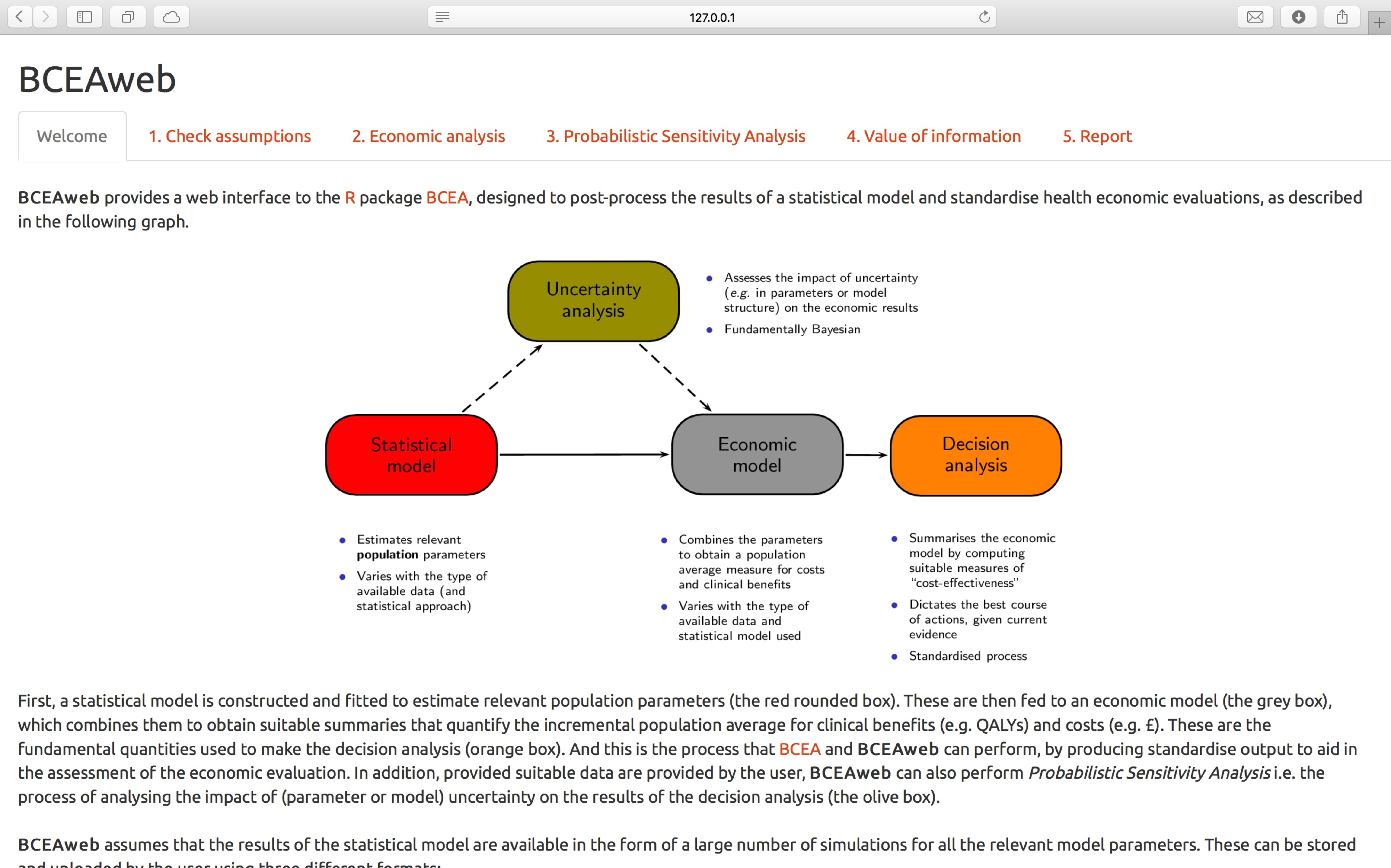 At a first look, BCEAweb seems to be a regular web page, and it actually is. The welcome page, first displayed when accessing the web app, is shown in Figure 5.1. This page provides details about what BCEAweb is, how to use it and about how it fits in the general process of a health economic evaluation. Many useful hyperlinks, coloured in orange, are included throughout the text. The tabs at the top of the page can be clicked to navigate through the different sections of BCEAweb.