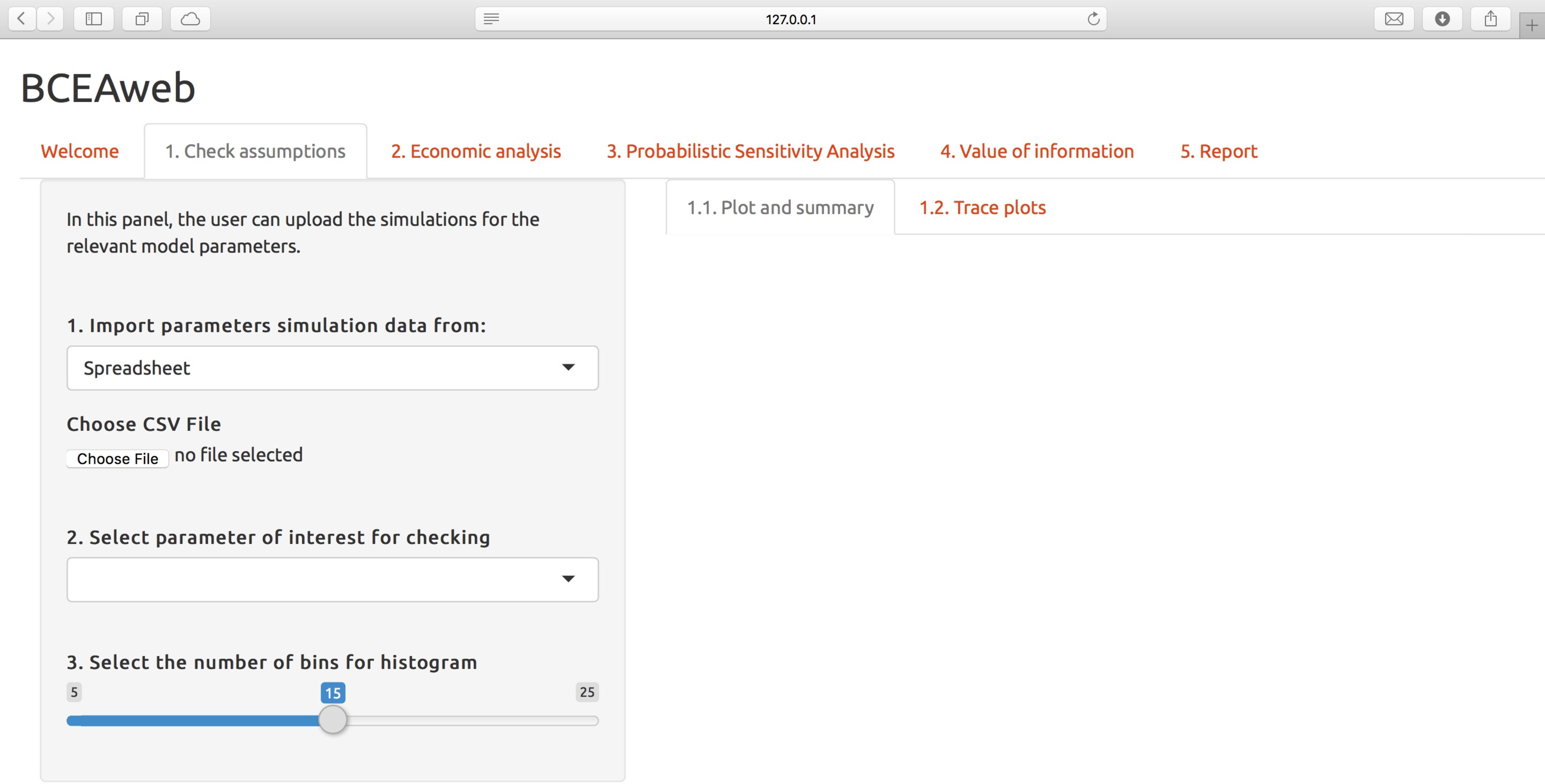 The first tab of the web app is called “Check Assumptions”. It is sufficient to click on its name in the navigation bar to access it. In this page, the user can upload the simulations of the parameters used in the iterations of the PSA from any probabilistic form of an economic model. The functionalities are particularly useful to easily test for violations of distributional assumptions, which might be caused for example by miscalculations of the distribution parameters in models caused by a very large number of inputs. Rather than checking the values one by one, the correctness of the sampled values can be analysed based on the analysis of the empirical (\(i.e.\) observed) distributions. This functionality extends BCEA and is not included in the R package. The web app will present the page shown in Figure 5.2.