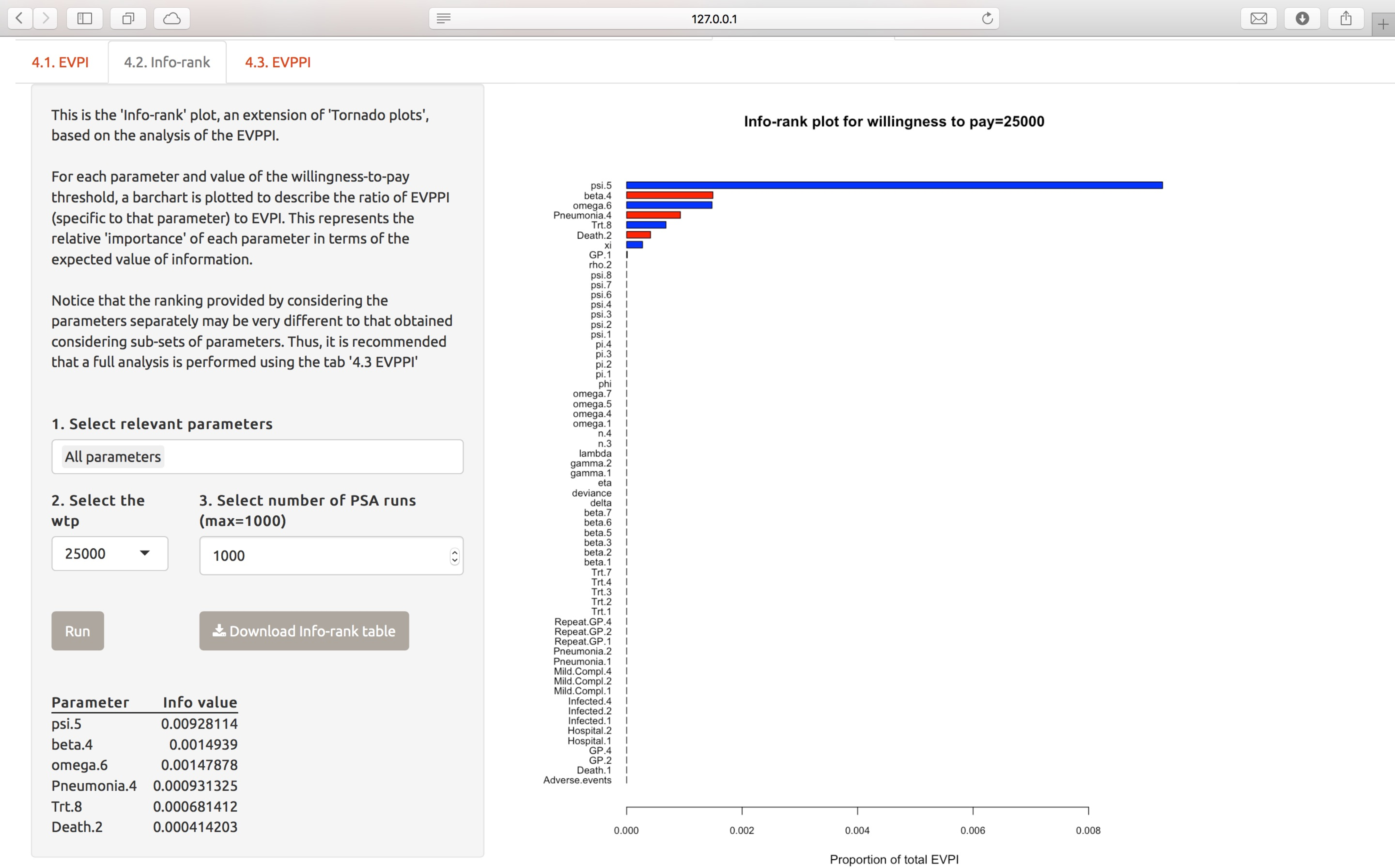 • Info-rank plot, an extension of the tornado plot, is useful to assess how parameters contribute to the uncertainty in the model by ordering them in decreasing order of the ratio of single-parameter EVPPI on EVPI in correspondence of a given WTP threshold (shown in Figure 5.8).