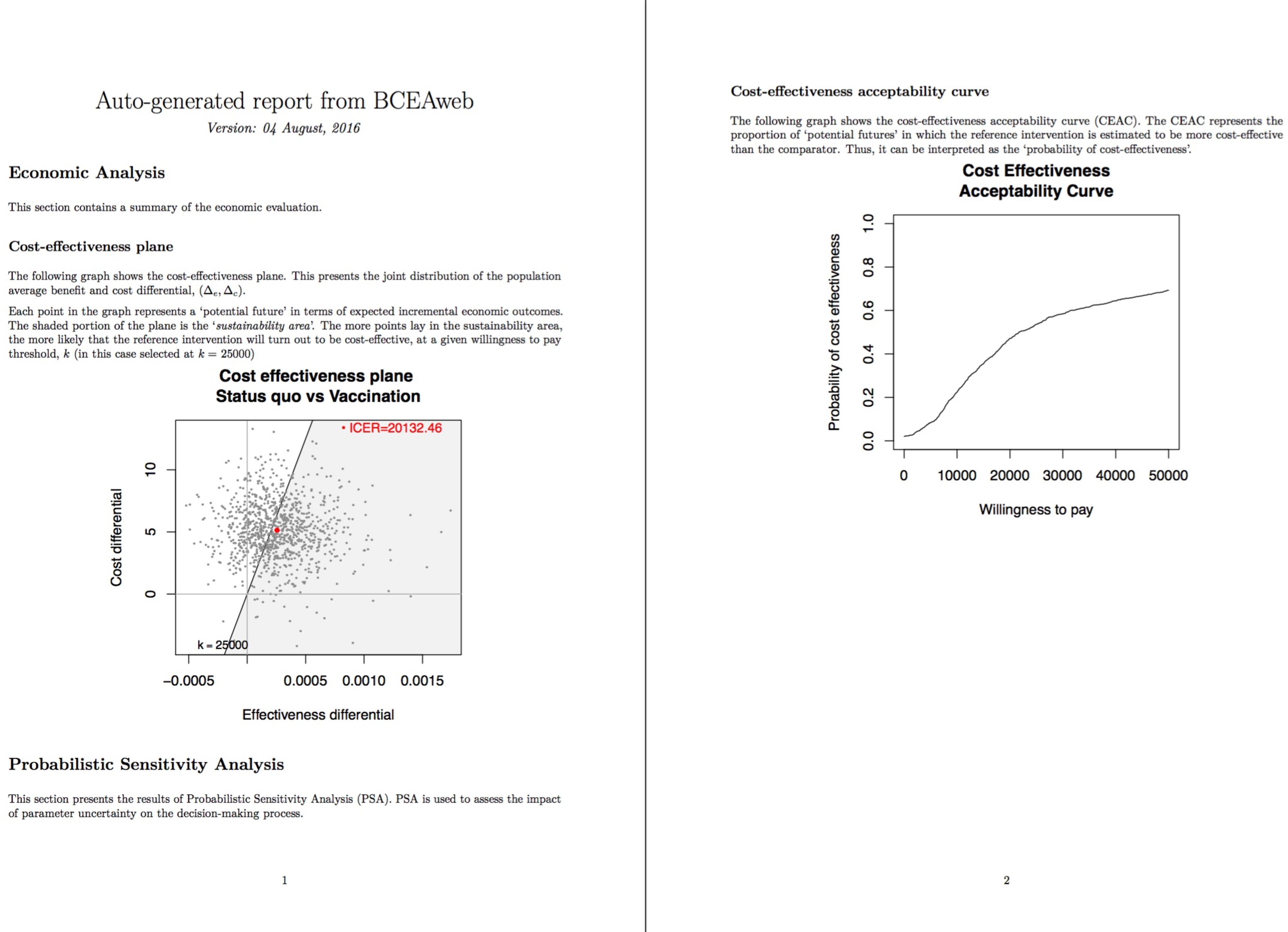 To download the report from BCEAweb it is sufficient to select the section required by the user, choose the preferred output format and click on the grey “Download” button at the bottom of the page. The report will be generated and downloaded; please note that in some internet browsers, depending on the user settings, the report might be displayed as a new web page. An example of a report generated by the web app for the vaccine example is shown in Figure 5.9. The cost-effectiveness plane and cost-effectiveness acceptability curve sections were selected to produce the report for the vaccine example.