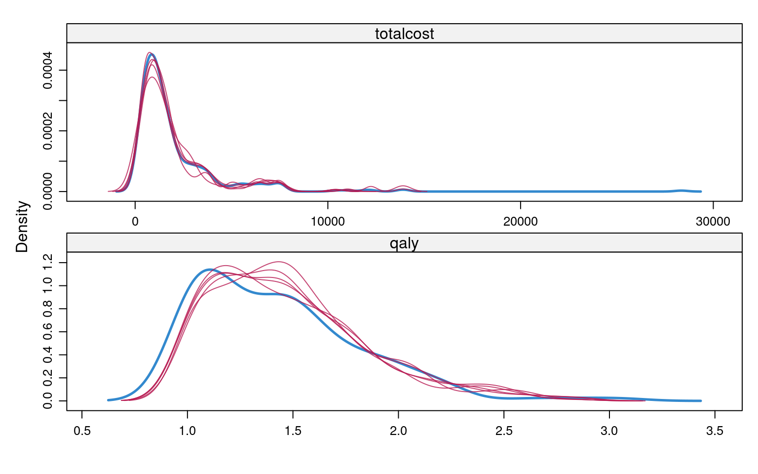 Although the choice of the missing data method is crucial, it is also of equal importance that the model for the full data distribution is specified so to take into account the statistical idiosyncrasies that affect both effect and cost data. Examples include: imbalances in baseline variables between treatment groups (Manca et al., 2005; Van Asselt et al., 2009); the correlation between the outcomes at both the patient level (Gabrio et al., 2021; O’Hagan and Stevens, 2001) and cluster level (Gomes et al., 2012; Ng et al., 2016); the high level of skewness characterising quality of life and, especially, cost data (Basu and Manca, 2012; Diaz-Ordaz et al., 2014b; Thompson and Nixon, 2005); the presence of spikes at one or both of the boundaries of the range for the underlying outcome distribution, e.g. null costs or perfect health states (Baio, 2014; Gabrio et al., 2019). In addition, when missingness arises, the choice of the analysis model is complicated by the fact that the fit of the models cannot be checked against the unobserved values and the robustness of the results to alternative specifications and missingness assumptions should be investigated in sensitivity analysis (Gabrio et al., 2019; Leurent et al., 2020).