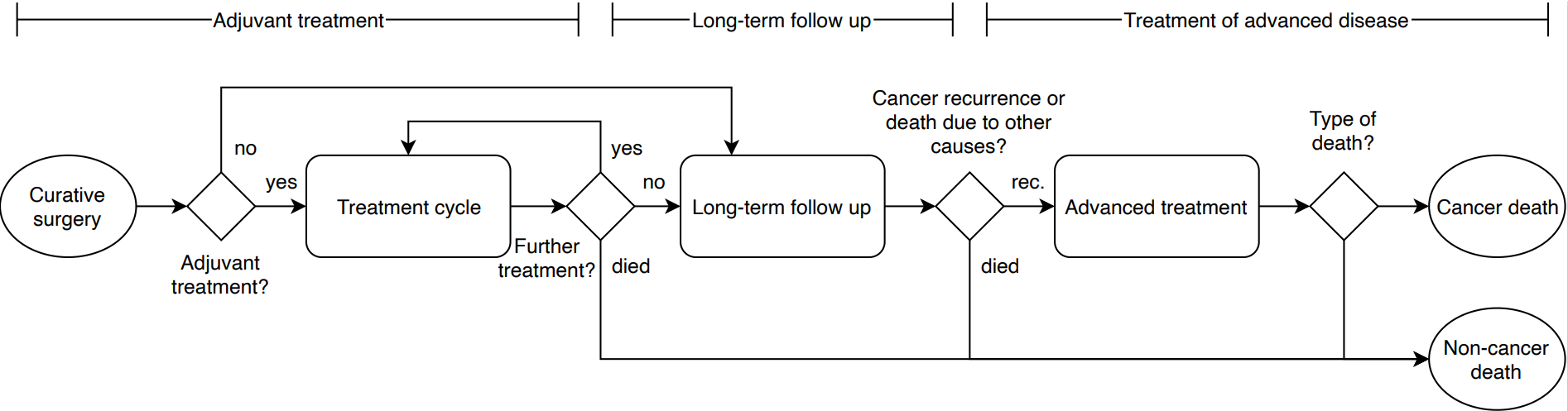 Upon cancer recurrence, which may either occur when individuals are receiving adjuvant treatment or when they are on long-term follow up, individuals are directed to the traj_recurrence trajectory. This trajectory processes the outcome and impact of treatment for advanced disease.