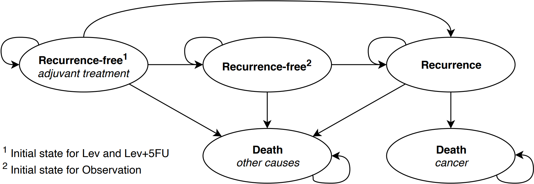 If an individual did not receive adjuvant treatment (TreatmentArm = 0), or if an individual completed the maximum number of treatment cycles, the long-term outcomes need to be determined and accounted for as part of the long-term follow up. There are two competing events that may occur next: