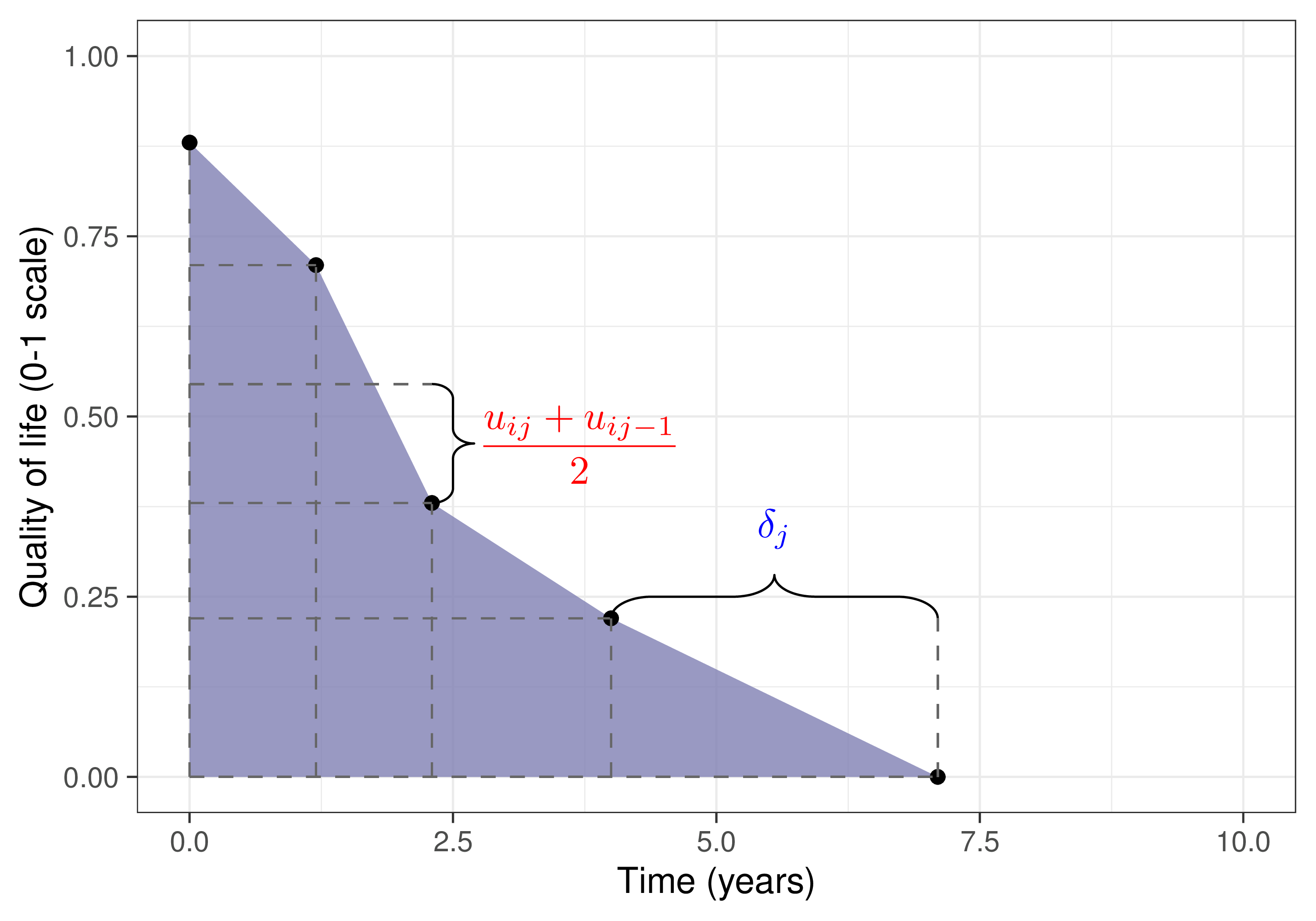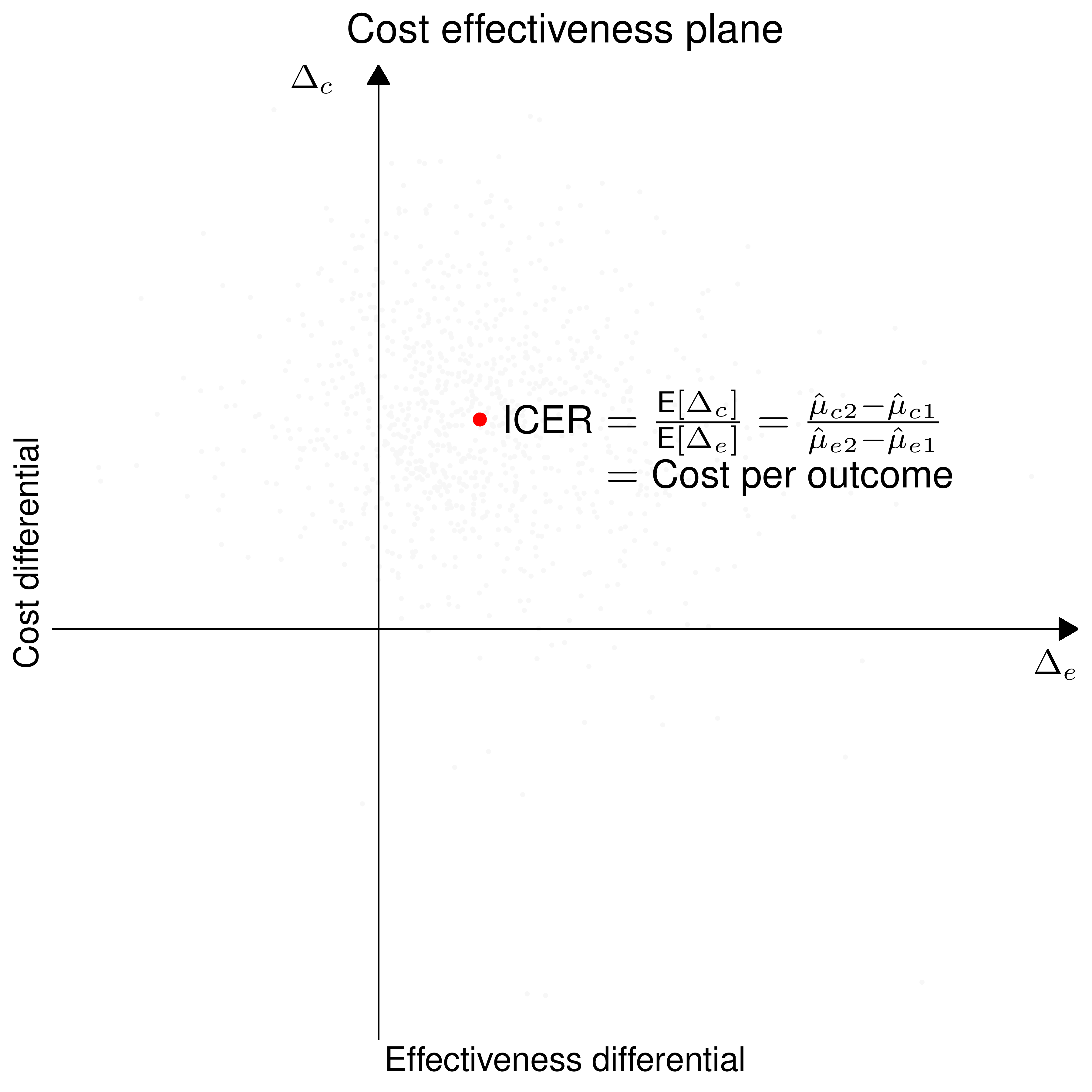 For each intervention \(t\), outcomes \(o = (e, c)\) are valued by means of a pre-specified measure of utility \(\class{myblue}{u(e, c; t)}\)