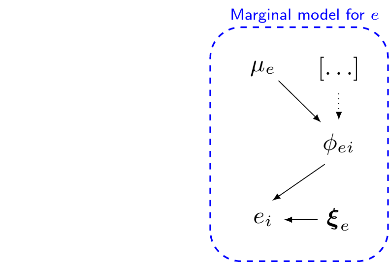 e_i & \sim & p(e \mid \phi_{ei},\bm\xi_e) \\